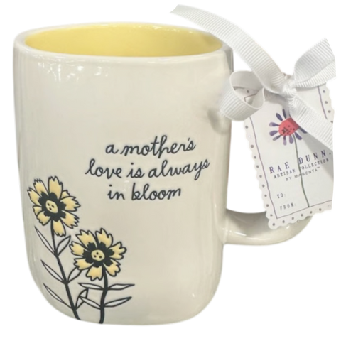 White mug with floral design and text 'a mother's love is always in bloom' on a white background