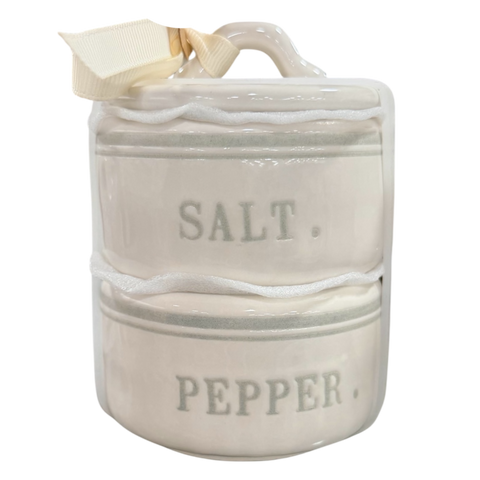 Set of ceramic salt and pepper shakers with handle on a white background